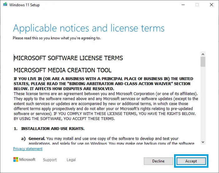2. Once the tool is downloaded, open up the mediacreationtool.exe program and you will be presented with Microsoft's software license agreement. Hit Accept.
