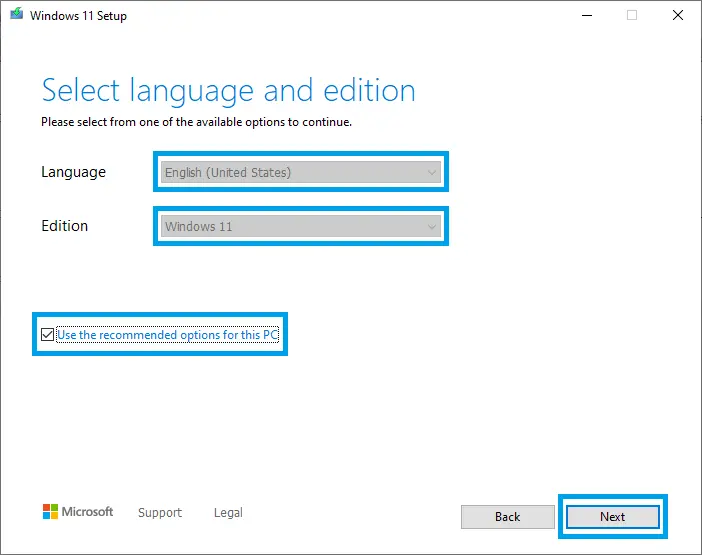 3. On the next screen you will be presented with language and edition options. Depending on the language and specifications of the PC you're running this tool on, you may not be able to change the default selections (they will be greyed out) until you uncheck the box which says Use the recommended options for this PC. If you do plan on using this bootable USB on the same PC to perform an upgrade, please ensure your language is set to the same language as your current operating system. Once your options are set, click on Next.