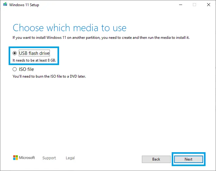 4. When prompted to choose which media to use, we are going to select USB flash drive and hit Next. If you wanted to download an *.ISO copy of the installers to burn on a DVD, you could choose the ISO file option here, but for this demo we are looking at USB creation.
