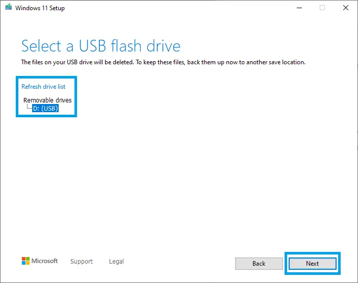 6. Click on Refresh drive list so that your USB flash drive shows up and is selectable from the list. Make sure to select the correct drive, and hit Next.