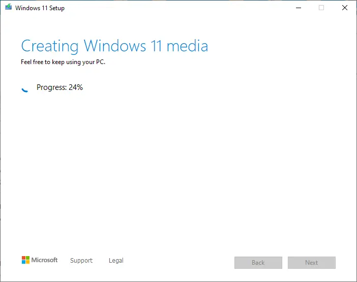 8. Once the installation files are finished downloading, the screen will change indicating that the Windows 11 media (your USB flash drive) is being provisioned and created.