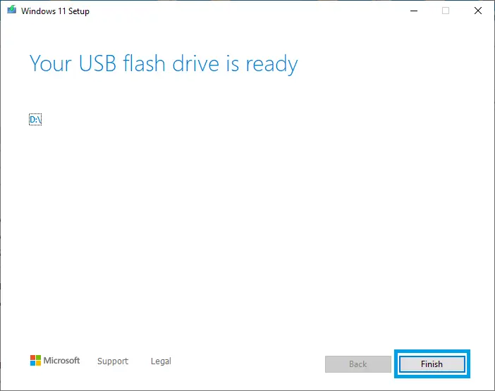 9. After this completes, the window will inform you that your USB flash drive is ready for use. You can click on Finish to close the Media Creation Tool.