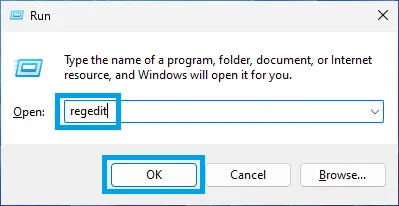 1. Press the Windows Key + R to open the Run dialog box. In the text field, type regedit and hit Enter, or click on OK.