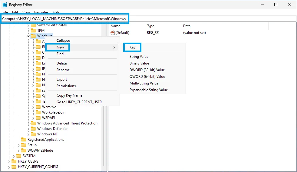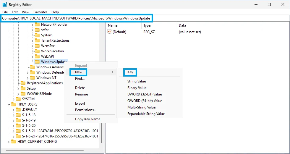 1A. Right-click on the Windows key and select New -> Key. Name the key WindowsUpdate and hit Enter.