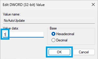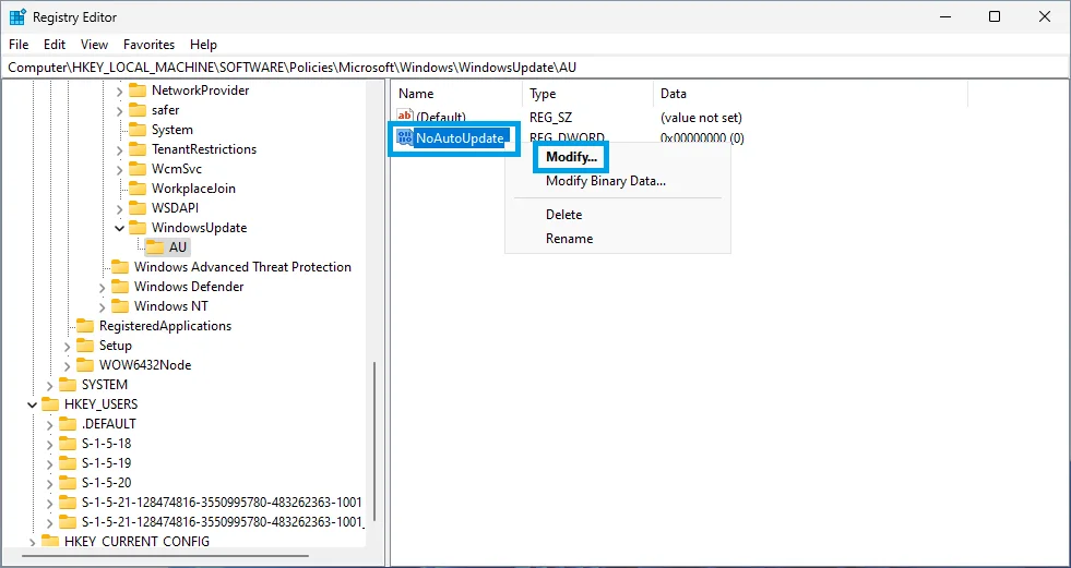 4. Right-click on the new NoAutoUpdate key and select Modify...