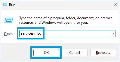 1. Press the Windows Key + R to open the Run dialog box. In the text field, type services.msc and hit Enter, or click on OK.