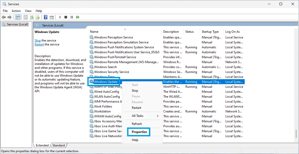 2. The Services window will open, and you'll want to scroll down to the Windows Update item in the list. Right-click on this item and choose Properties.