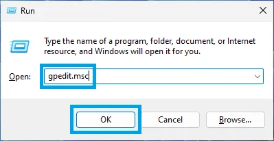 1. Press the Windows Key + R to open the Run dialog box. In the text field, type gpedit.msc and hit Enter, or click on OK.