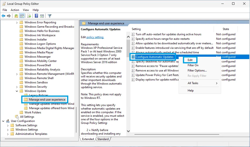3. In the right-hand pane, right-click on the item called Configure Automatic Updates and select Edit.