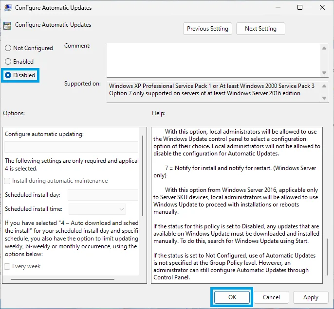 4. In the new window which opens, click the bubble on the left which says Disabled and hit OK.