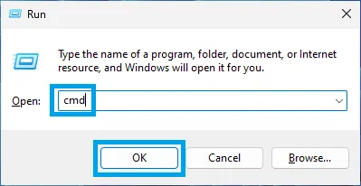 A. Open a new Command Prompt window by pressing Windows Key + R to open the Run dialog box. In the text field, type cmd and hit Enter, or click on OK.