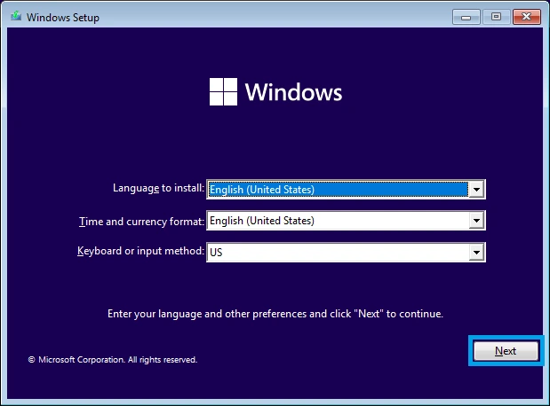 1. Boot into the USB thumb drive containing the Windows 11 operating system setup on it. At the first screen you will be prompted to select your language, time format, and keyboard settings. Select the appropriate options for you, and hit Next.