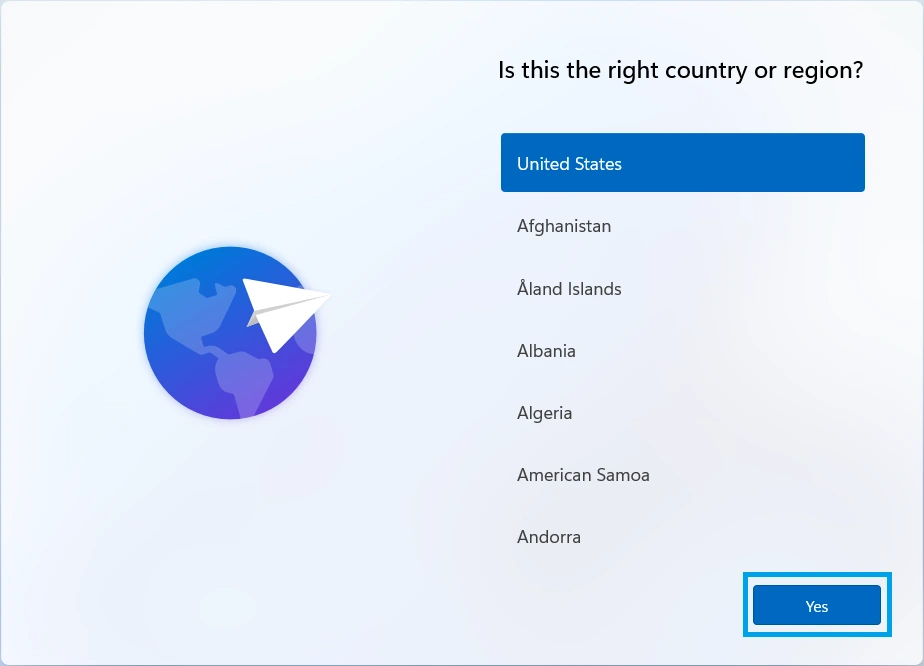 11. After the computer restarts, you'll be presented with the out-of-box-experience (OOBE) again. On the first screen, you'll be asked to select the country or region. This time, make your choice and choose Yes.