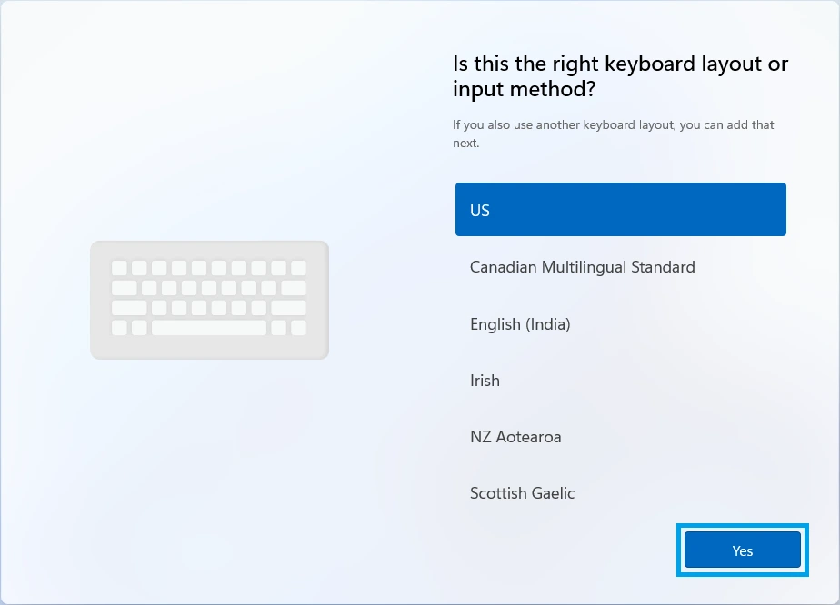 12. Choose the correct keyboard layout for your computer and click Yes. A subsequent follow-up question will be asked on whether you want to add a second keyboard layout. If you want to add a layout, click on Add layout, otherwise click Skip.