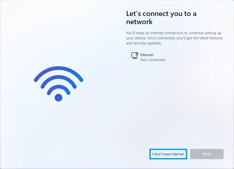 13. On the "Let's connect you to a network" screen, you should now have the ability to choose the I don't have internet option. Click on it to continue.
