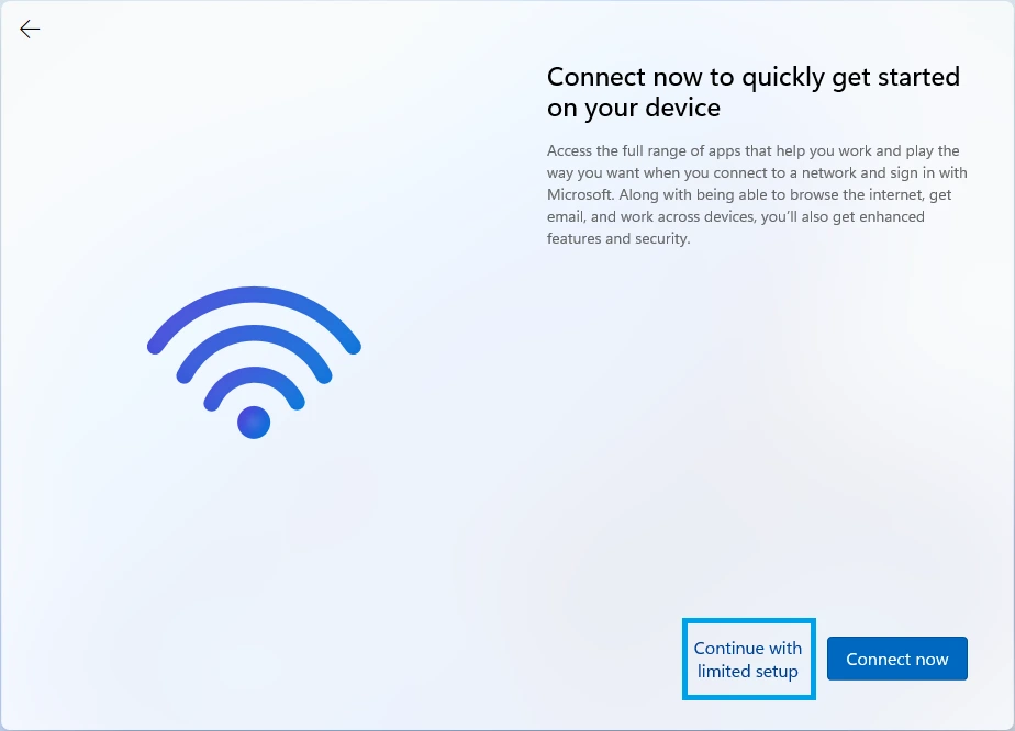 14. It will then present another screen wanting you to connect now, but here we will select Continue with limited setup.