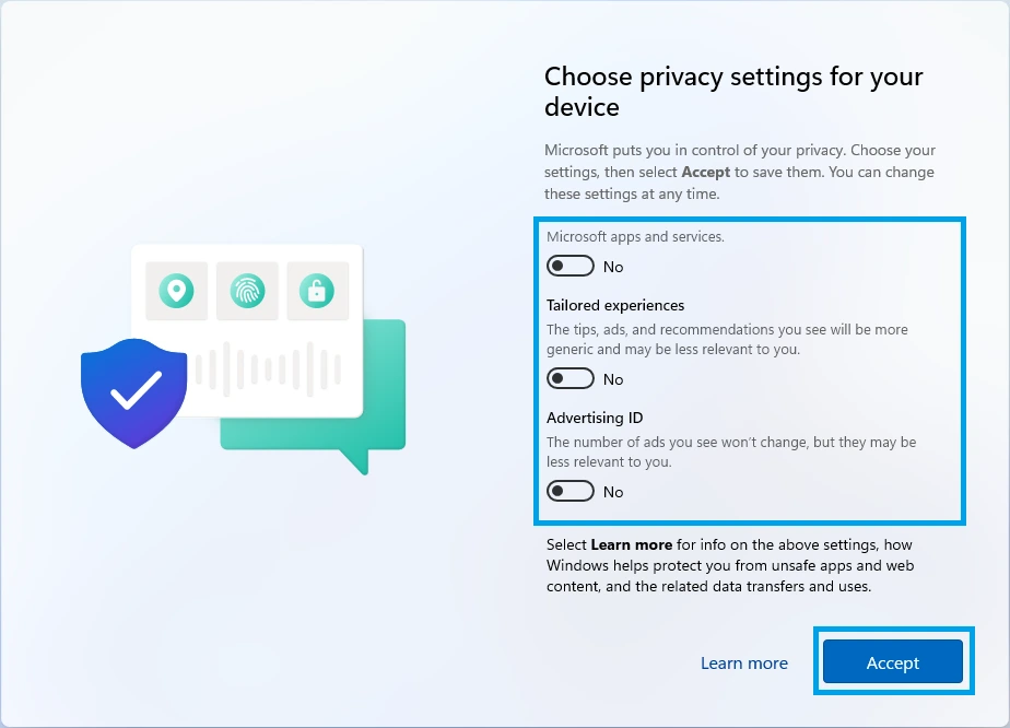 17. After this, you can select the privacy features you would like to enable or disable, then make sure you scroll to the bottom of the list and hit Accept.