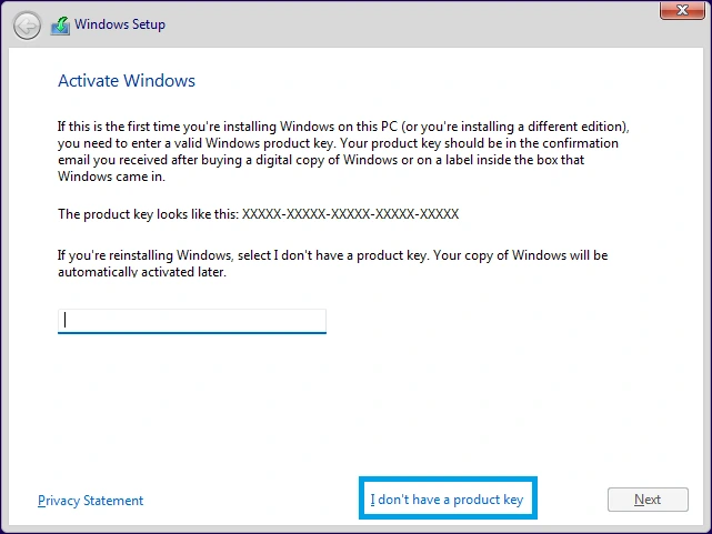 3. This should popup a new window asking you to Activate Windows. If you have a product key, you can enter it here, then click Next - OR - if your machine does not require it, you can click on I don't have a product key and Windows will attempt to automatically activate once it is installed on your computer.