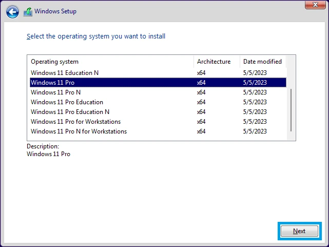 4. Select the edition of Windows you would like to install on your machine, then hit Next.