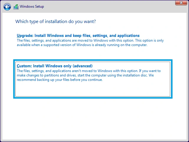 6. The next screen will ask you which type of installation you would like to perform. For most wipe-and-reload scenarios (and for the purposes of this walkthrough), we will click on Custom: Install Windows only (advanced). If you were upgrading from a previous version of Windows such as Windows 10, you may choose the top option to upgrade your current machine.