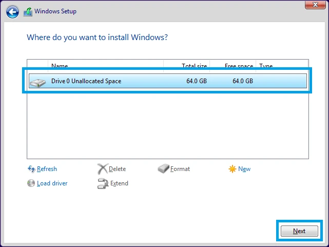 7. Setup will then ask you where you want to install Windows. On a completely fresh install, I personally like to delete all of the partitions so everything is set to Unallocated Space, then just ensure Drive 0 Unallocated Space is selected and hit Next. You may want to partition your drives differently during setup, and that is up to you, but for this demo, I am keeping things simple and using 1 partition only.